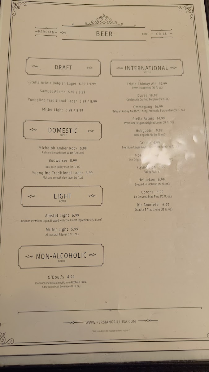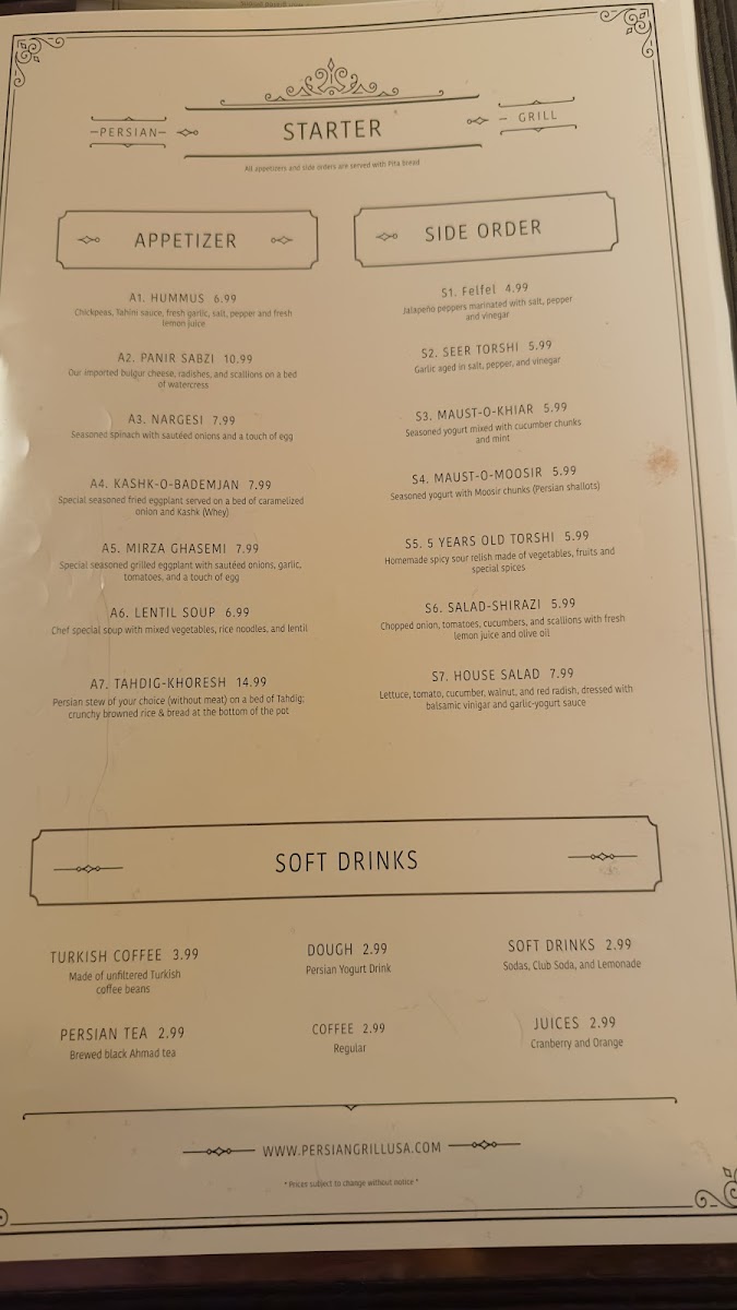 - Drinks: The beverage menu includes fruit juices like grapefruit, cranberry, and orange juice, as well as standard sodas with various flavors. Traditional drinks are also available, including Dough (a yogurt-based drink with club soda and mint), Turkish Coffee, Persian Tea, and iced tea.